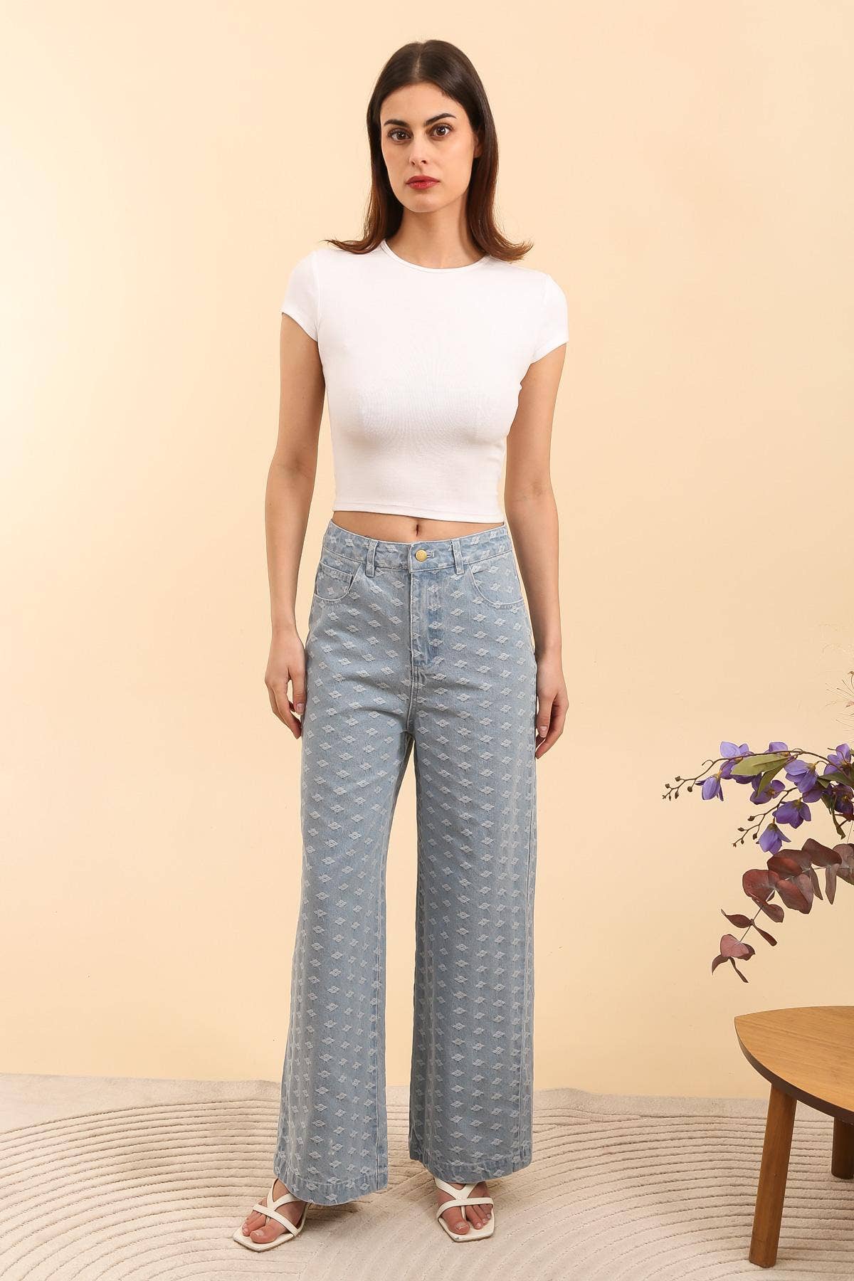 Affirmez votre style avec ce pantalon large en denim style patte d’éléphant, orné d’un motif ethnique tissé all-over pour une allure bohème et tendance. Sa coupe ample et confortable assure liberté de mouvement et élégance au quotidien.