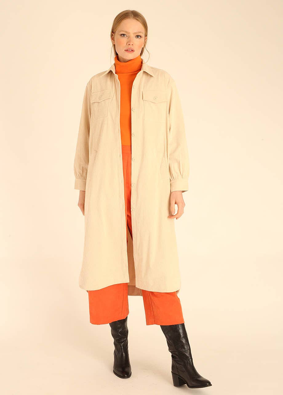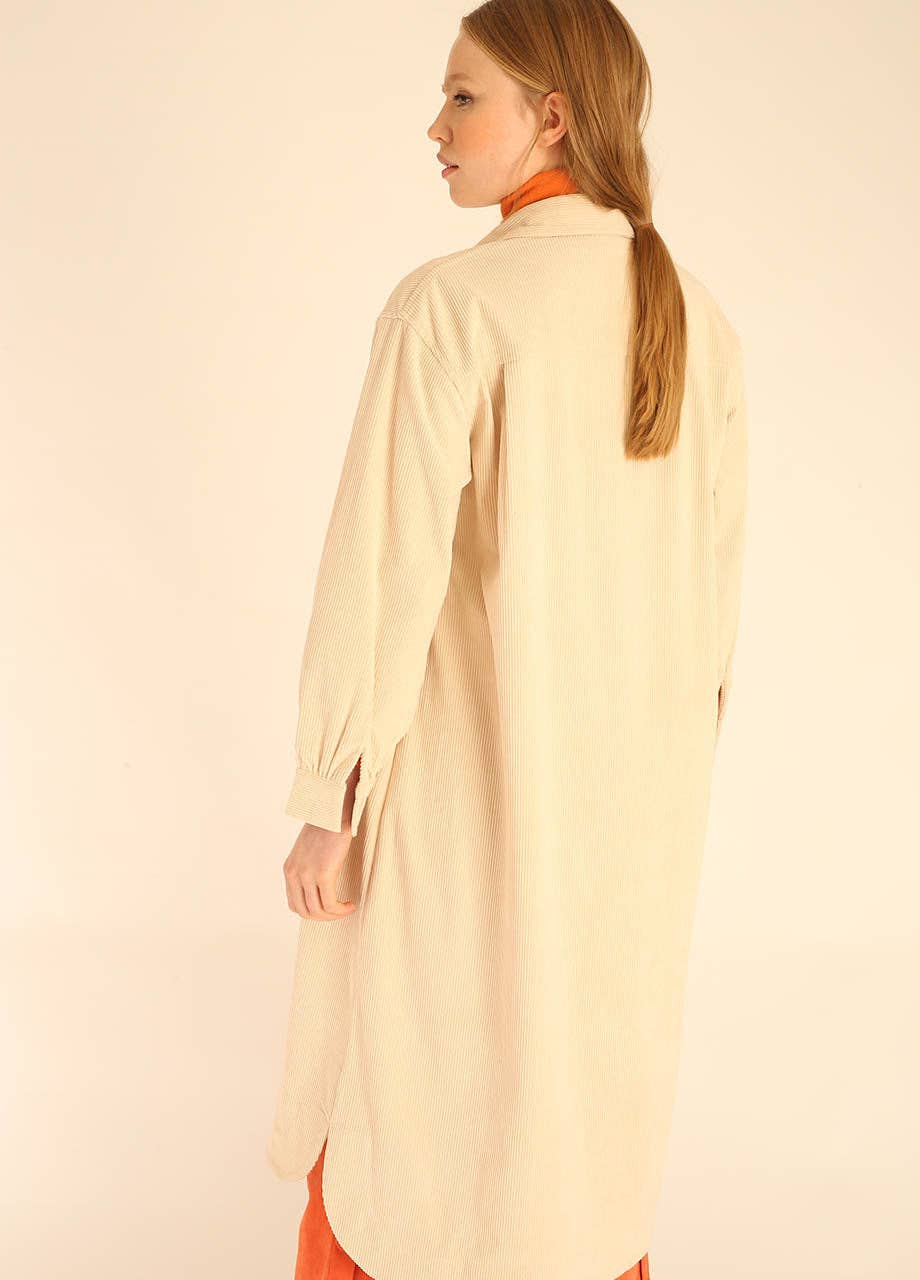 La surchemise longue en velours côtelé beige est la pièce parfaite pour un look à la fois décontracté et tendance. Confectionnée en 100 % coton, cette veste-chemise allie confort, douceur et style.